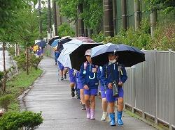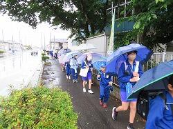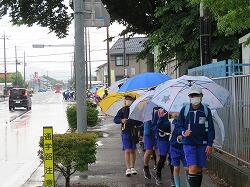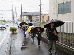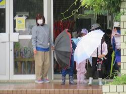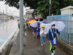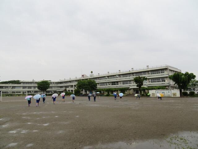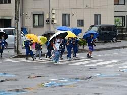 あいにくの雨の中の登校となりました。様々な色の傘が、校庭を彩りました。