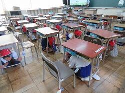 竜巻予報に伴い、まず、教室に避難をします。その後、竜巻が近づいたことを想定して、教室での避難の仕方を行いました。予告をせずに行う訓練でしたが、放送を聞いて避難することができました。