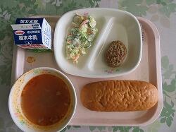 今日の給食は「ごぼう入りバーグ」「コールスローサラダ」「ミネストローネスープ」でした。