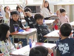 「What your name?」ゲームを行いました。ゲーム感覚で名前を尋ねて、ヒントをもらって、子供たちはそれが誰なのか考えていました。そして、当たると大喜びにとびはねていました。