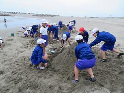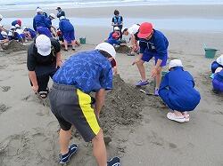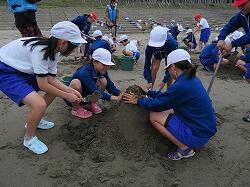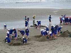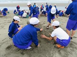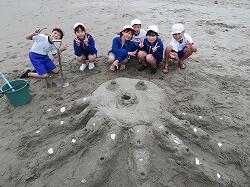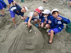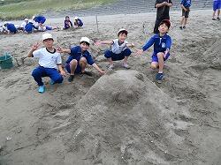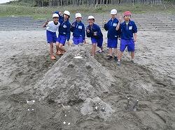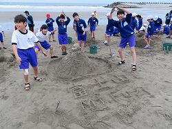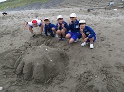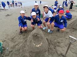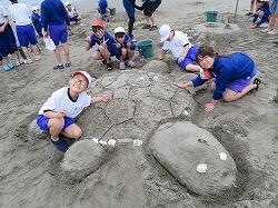 班ごとに協力して砂の造形を行いました。貝殻などを利用したり、海水を上手に使ったりしながら、作品づくりに取り組みました。