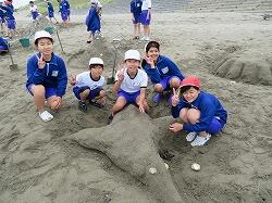 みんなでつくった砂山を利用して、砂の造形スタートです。それぞれ班がんばって、砂の造形が完成しました。何をつくったか分かりますか?