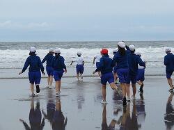立派な態度で話を聞いていますね。海に向かって出発です。先生方は、もしもの時のためにライフジャケットを着用していますね。