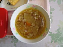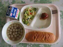 今日の給食は「ビック肉団子」「花野菜サラダ」「ポトフ風スープ」でした。
