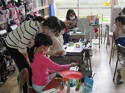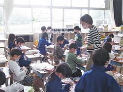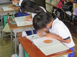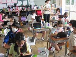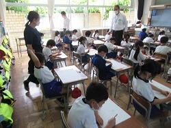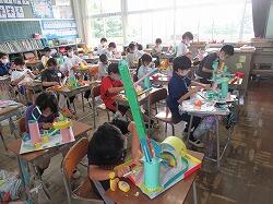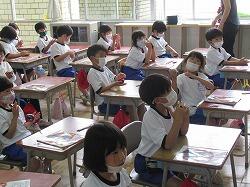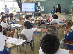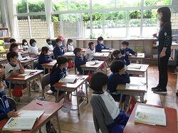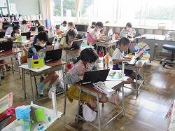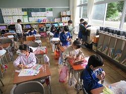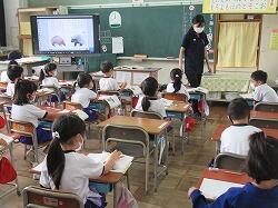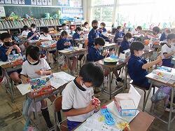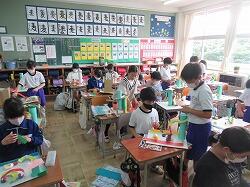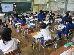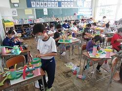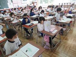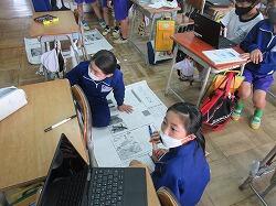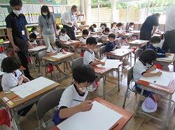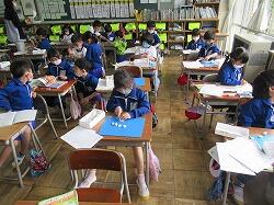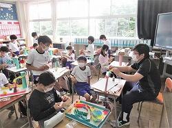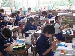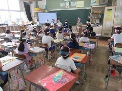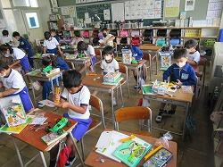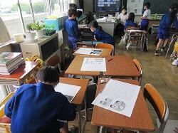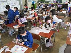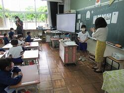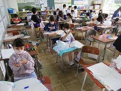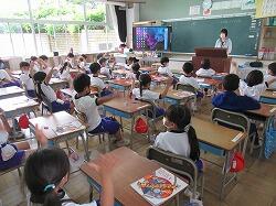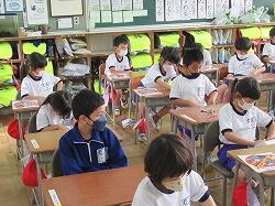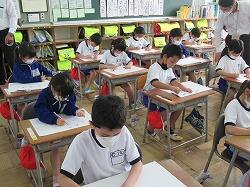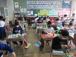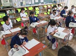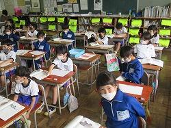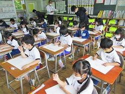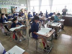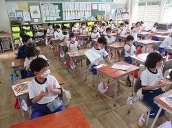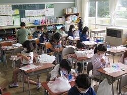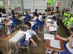 <1年2組> 図工の「おはなしからうまれたよ」という授業におじゃましました。「くじらぐも」という物語を読んで、クジラ雲に乗って行ってみたいところを絵に表していました。この授業は、新採教員への示範授業として実施され、数名の教員が参観に訪れていました。その中でも、子供たちは、のびのびと発表したり、絵を描いたりしていました。子供たちの創造力は無限ですね。素晴らしい発想に驚かされます。