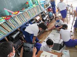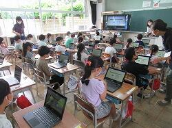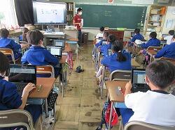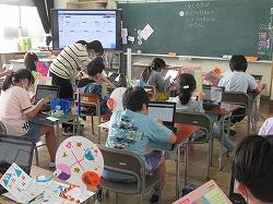 <3年1組> 図工の「くるくるランド」の授業におじゃましました。わりピンを使って紙を回す仕組みを使って、くるくる回転する楽しい作品を作製しました。そして、タブレットのアプリに、作品の写真と解説を載せて、全員で共有しました。おじゃましたときは、友達の作品にコメントを書き入れていました。友達の作品のよいところをたくさん発見していました。3年生ともなると、タブレットの使い方もスムーズです。
