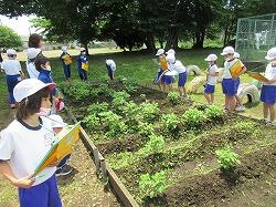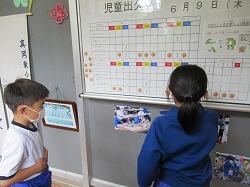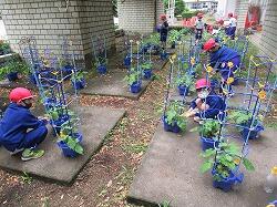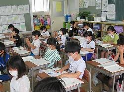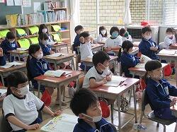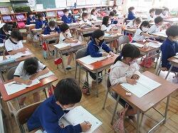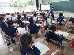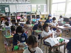 <2年1組> 国語の「かんさつしたことを書こう」という授業におじゃましました。2年生は、ミニトマトの苗を育てています。もう花が咲き、実がなっている子がたくさんいます。その観察カードを国語の授業でも活用しています。数や色、形、大きさなどのポイントを外さず書けているか、確認していました。ちなみに絵がとっても上手でした!