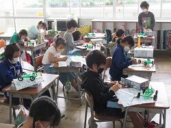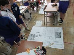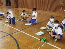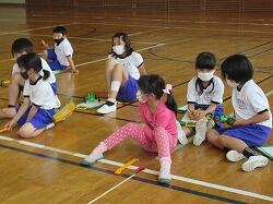 <3年1組> 理科の授業におじゃましました。ゴムの力で動く車を使って、ゴムの伸びて戻ろうとする力を調べました。体育館でグループごとに実験をしました。今日は、理科の授業力向上のため、市の科学教育センターの先生が参観されていました。放課後に、指導・助言をいただきました。