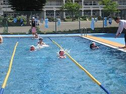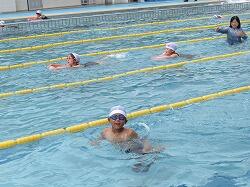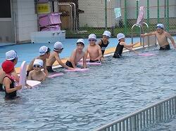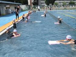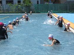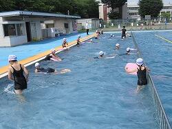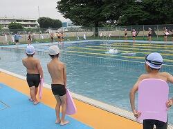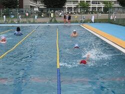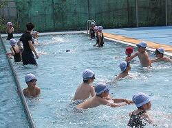 <1年2組> 体育の水泳の授業におじゃましました。水の中を歩いたり、歩きながらもぐってみたり、水に慣れることが中心でした。顔が水につけられるようになるといいですね。家のお風呂でも挑戦してみてください。