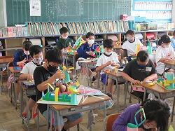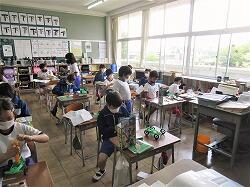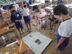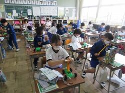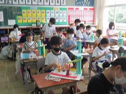 <3年3組> 理科の授業におじゃましました。風やゴムの力で動く車を作っていました。風やゴムのはたらきを調べる学習です。車に帆を付けて風の力で走らせたり、ゴムの力でプロペラを回して走らせたりします。楽しそうですが、風やゴムのエネルギーを使った仕組みです。SDGsにつながる授業と言えます。