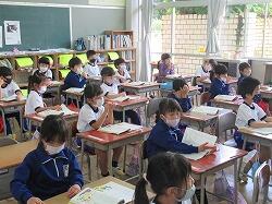 <1年1組> 国語の授業におじゃましました。平仮名の伸ばす音の復習をしていました。手拍子に合わせて発音をすることで伸ばす感覚を確かめていました。「とおくの おおきな こおりの うえを おおくの おおかみ とおずつ とおった」何回も練習してみましょう!