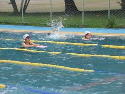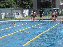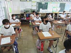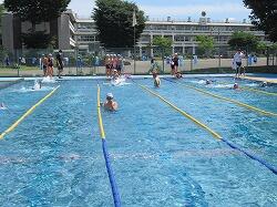 <5年2組> 体育の水泳の授業におじゃましました。コースを使って、どんどん泳いでいました。数少ない水泳の授業です。泳げるときにたくさん泳いで、泳ぎを身に付けましょう。コースは一方通行で、間をとって泳ぎます。ビート板は1人1枚固定で使用としています。この夏の目標にチャレンジしてください。