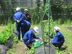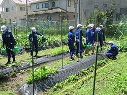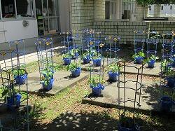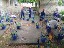 1年生のアサガオのツルが伸びています。今日、支柱が立てられました