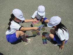 <2年2組> 図工の「ひかりのプレゼント」という授業におじゃましました。透明の容器等にカラーセロハンを貼ったり、ペンで色を塗ったりして、窓際で光にかざして、白紙に映して楽しみました。カラフルに変身した容器を通り抜けた光は、台紙にカラフルな模様を映し出します。とってもきれいでした。まさに、「光のプレゼント」でした!