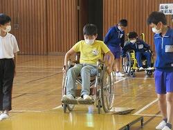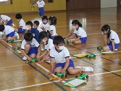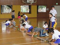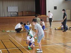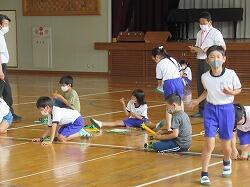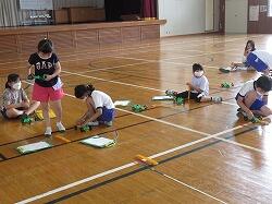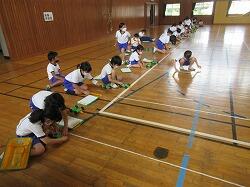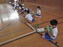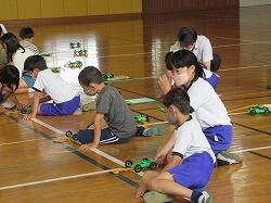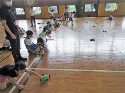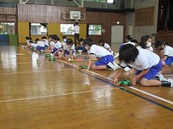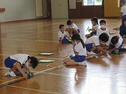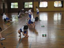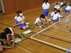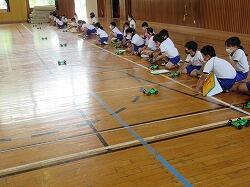 <3年2組> 理科の授業におじゃましました。1組と同じゴムの力で動く車を使って実験を、体育館で実施しました。ゴムを伸ばす長さによって、走る距離が違ってくることが分かりました。この授業も、科学教育センターの先生に見ていただき、指導・助言をいただきました。