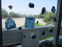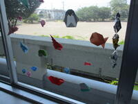 学校司書の先生が、季節に合わせていつも飾りつけを工夫してくれていて、暑い日が続いている今は、図書室入口には風に揺れるとても涼しげな飾りが下げられています。