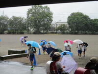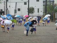 マスクを外している子はずいぶん増えました。傘さし登校をしている子もいます。