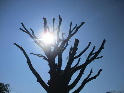 正面玄関前にある"大欅の木"は枝下ろしをして青空をバックにすっきりとした姿を見せています。