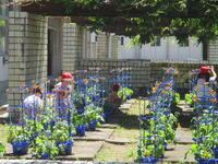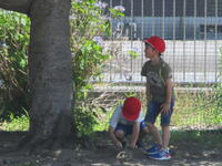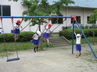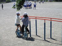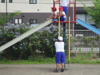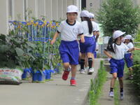1年生の東っ子は、大事に育てているアサガオに水やりもしていました。日陰で遊んでいる東っ子もいます。