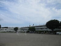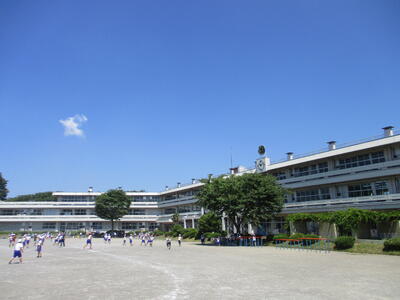 正門や東門から見た真岡東小学校の白くて"クの字"型の特徴的な校舎が青空に映えています。