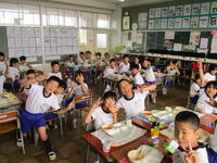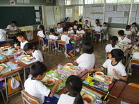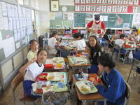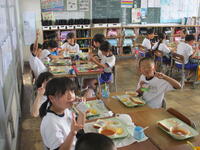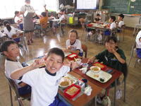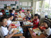 5年生の東っ子たちは「三色ごはんがおいしいでーす!」「私はヨーグルトが好きです!」などと言いながら、今日もとてもおいしそうに給食を食べていました。