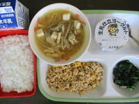 今日の真岡東小学校の給食は、あじのねぎみそ焼き、青菜のナムル、巻狩汁、ごはん、牛乳のメニューで、604Kcal(中学年)でした。