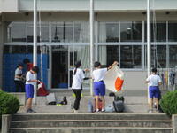 国旗、市旗、校旗を降納して片付けしている東っ子もいます。