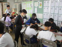 教育実習生も昇降口で先生方と一緒に東っ子たちを出迎えています。英語専科の先生と東っ子たちは今朝も元気に大きな声で「グッドモーニング!」とあいさつをしています。英語専科の先生と"ジャンケン"をしている東っ子もいました。