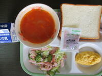 今日の真岡東小学校の給食は、プレーンオムレツ、ハムと野菜のマリネ、県産トマトスープ、ミルク食パン(とちおとめジャム)、牛乳のメニューで、618Kcal(中学年)でした。