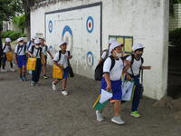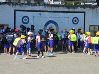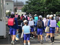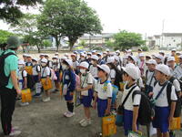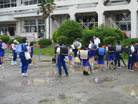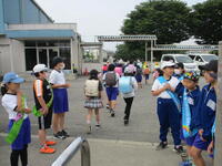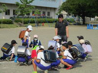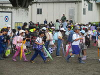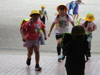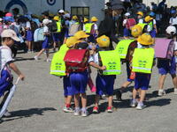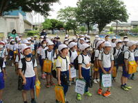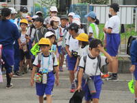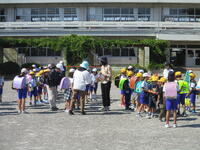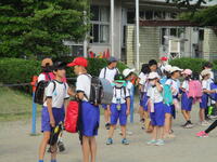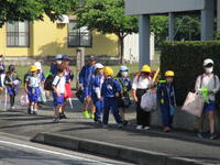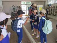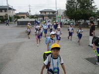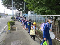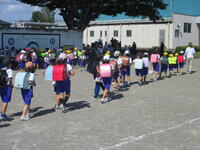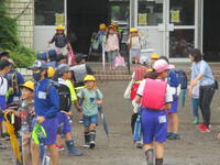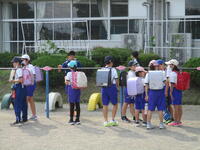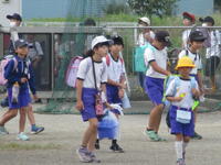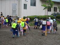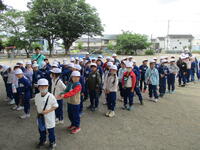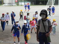 1年生と3年生が登下校班ごとに整列して下校して行きました。