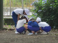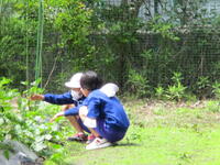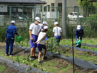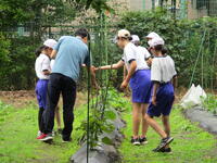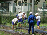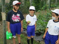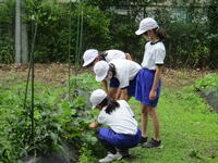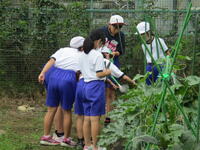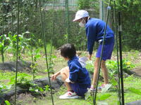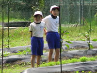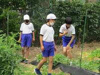 学校農園に行って、育てている野菜の世話をしたり、様子を見たりしている東っ子と先生もいました。