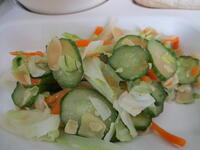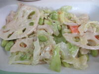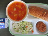 今日の真岡東小学校の6月最初の給食は、キャベツ入りメンチカツ、枝豆入りサラダ、ミネストローネスープ、パインパン、牛乳のメニューで665Kcal(中学年)でした。
