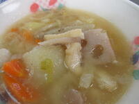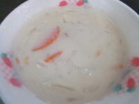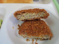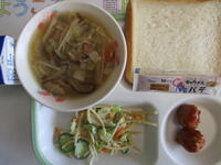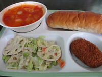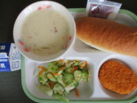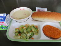 今日の真岡東小学校の給食は、野菜入りコロッケ、アーモンドサラダ、クラムチャウダー、コッペパン(ミックスジャム)、牛乳のメニューで699Kcal(中学年)でした。