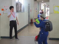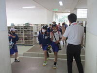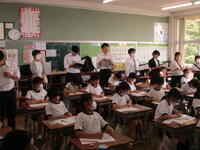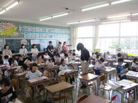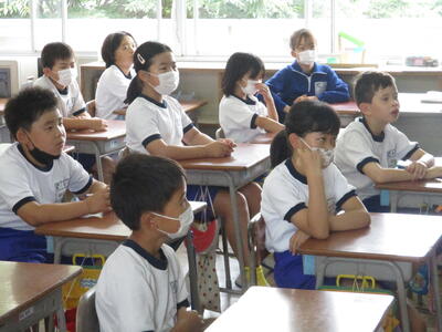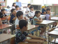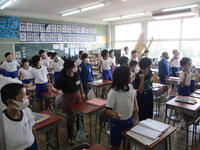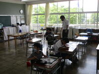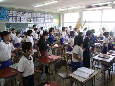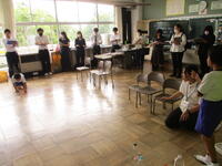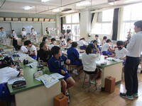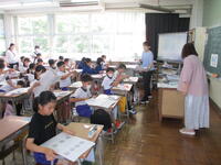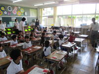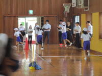 4人の中学生はまず初めに職員室であいさつをして、その後は先生方から話を聞いたり、先生方の手伝いをしたり、東っ子たちと一緒に「体力つくり」をしたり、初日からそれぞれが担当する学級の授業にも入ったりしながら、一生懸命にがんばって活動しています。