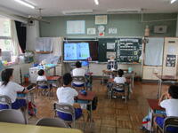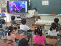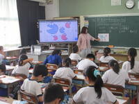 今日の授業では「あられ」や「めあて」の文字を筆を使って描いていました。電子黒板にはお手本のかき方が映像で映し出されています。