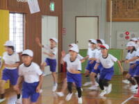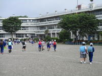 東っ子たちは、学年ごとに決まったメニューの運動に一生懸命、そして楽しそうに取り組んでいました。先生方も一緒に体を動かしています。テンポのよいBGMの曲に合わせて踊っている東っ子もいました。
