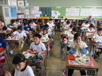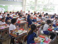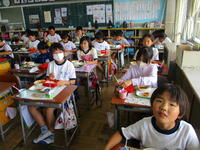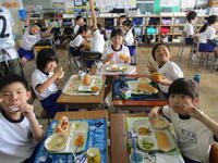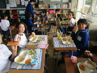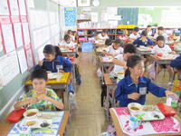 1年生の東っ子たちは、「きゅうしょくおいしー!」「らーめんおいしー!」などと言いながら、今日も給食をとてもおいしそうに食べていました。
