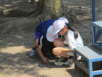 少し早めに猫が授業参観に来たようです。東っ子応援団の一員(一猫?)なのかもしれません。
