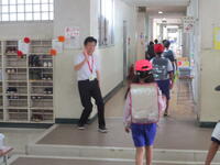 東っ子たちは今日も元気にあいさつしながら登校してきました。高学年昇降口では、英語専科の先生と東っ子たちが英語で元気よく「グッドモーニング!」とあいさつしています。