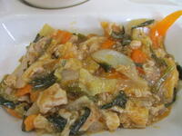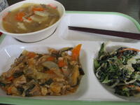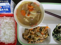 今日の真岡東小学校の給食は、セルフ豚キムチ丼、ひじきのごまあえ、いものこ汁、ごはん、牛乳のメニューで、621Kcal(中学年)でした。