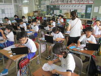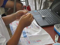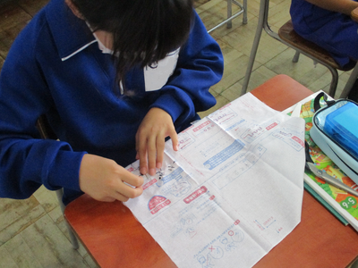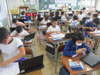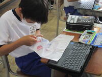 針と糸を使って"ソーイング"(ぬいもの)の学習をしていました。タブレットを使って、玉結びや玉どめ、いろいろな手縫いの仕方を確認しながら、一生懸命にぬいものに取り組んでいました。