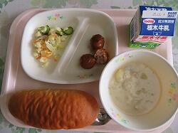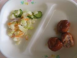 今日の給食は「肉団子」「イタリアンサラダ」「さつまいもシチュー」でした。