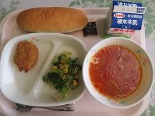 今日の給食は「コッペパン」「キャベツカツ・ソース」「カラフルサラダ」「ミネストローネ」でした。