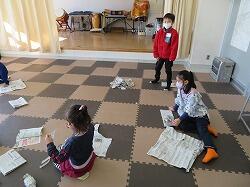 新聞紙を丸めたり、ちぎったり、折ったり、ねじったり、切ったり、重ねたりしながらいろいろな形を生み出していました。