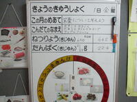 配膳室前の廊下には、すでに9月1日の給食のメニューが書かれています。   <9月の献立表>