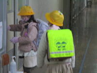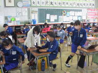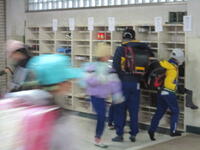 朝の昇降口で、1年生と2年生の係の東っ子が靴箱の靴の入れ方を確認していました。