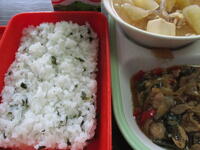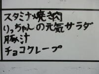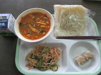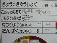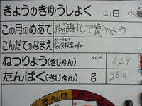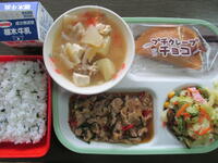 今日の給食は「大内西小学校リクエスト給食」で、スタミナ焼き肉、りっちゃんの元気サラダ、豚汁、チョコクレープ、わかめごはん、牛乳のメニューで、747Kcal(中学年)で、今月の最高カロリーの給食でした。