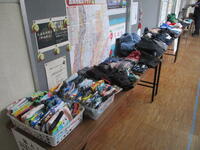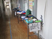 職員室の廊下には、名前の記入がないために、落とし主に戻れていない落とし物が長机の上にたくさん並べられています。