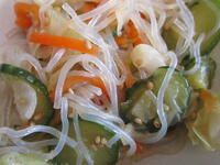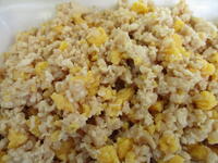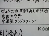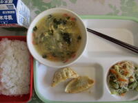 今日の真岡東小学校の給食は、ぎょうざの甘酢あんかけ、春雨サラダ、中華風コーンスープ、ごはん、牛乳のメニューで、642Kcal(中学年)でした。