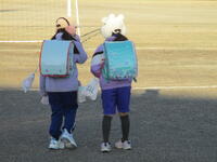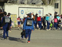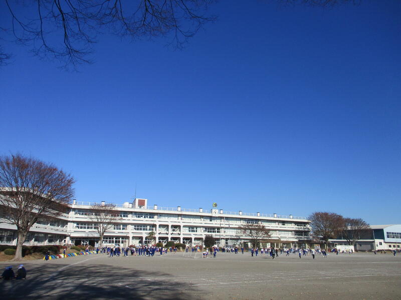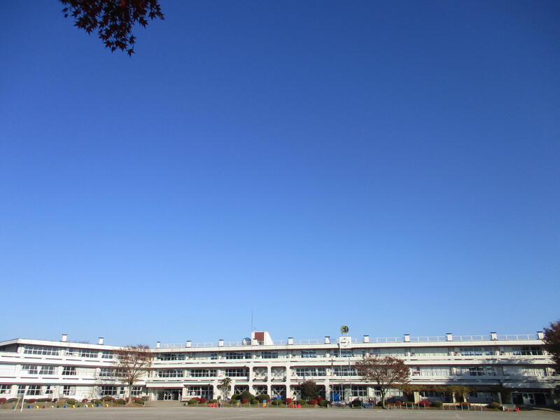雲ひとつない青空と、真岡東小学校の"  くの字"型の白い校舎と、いろいろな色の服装とランドセルの東っ子たちです。